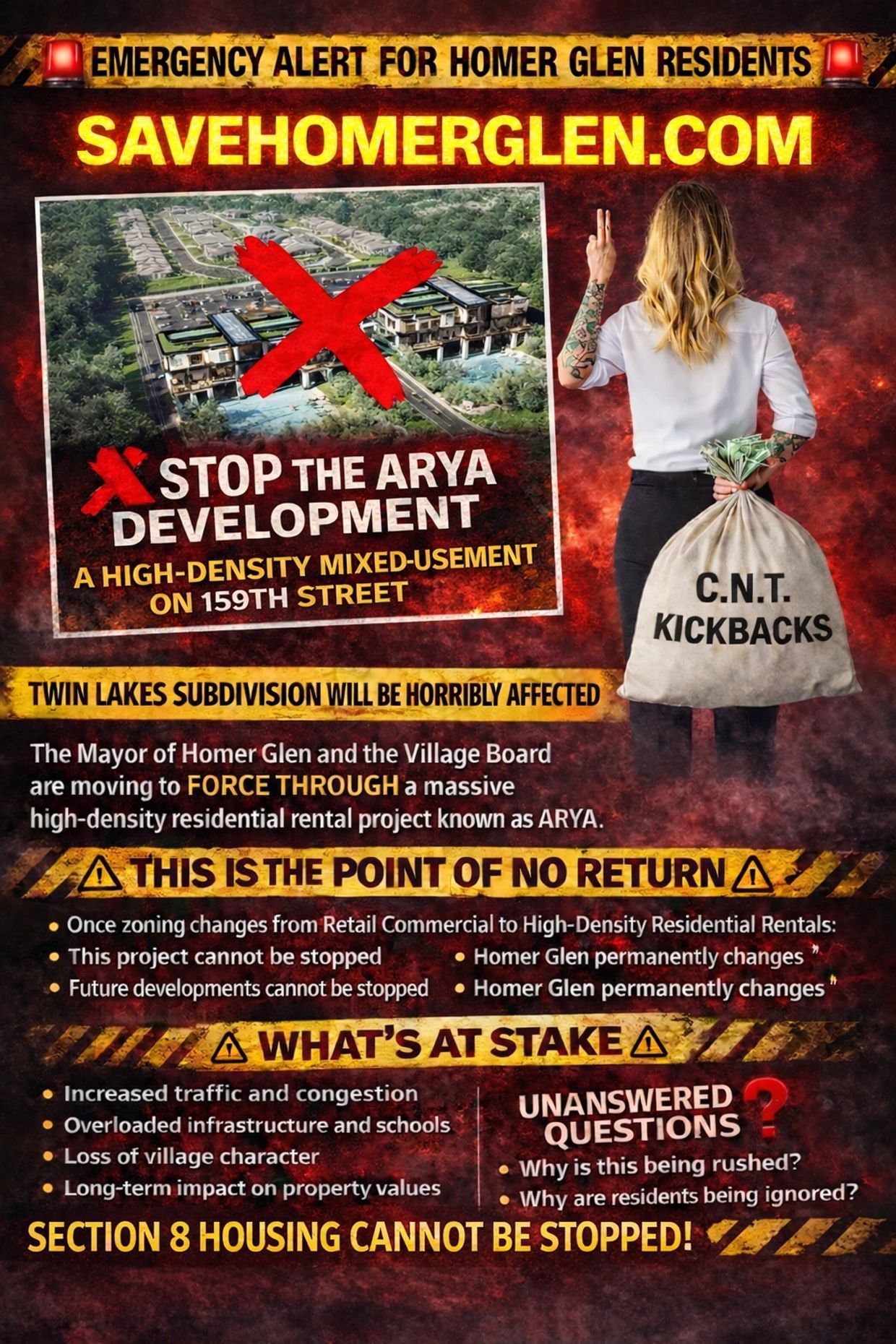 The ARYA developer Boris Predovich finally admits that this development may contain rentals and there is nothing that the Village can do about it once approved. Boris sugar coats it by saying that the rental cost and fees will be high but we all know what will happen if these units do NOT sell... Again, the mayor and the developer are in cahoots and they think that the residents of Homer Glen are gullible and stupid. Secret meetings and agreements have been made. Envelopes have been passed. The fix is in! We must stand up against this project and protect Twin Lakes, Country Woods and Homer Glen.